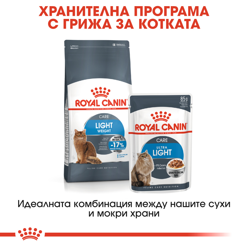 | Ако забележите, че котката ви уринира по-често от обикновено и не се съобразява с местата, на които го прави (т.е. извън котешката тоалетна) значи може би има уринарен проблем. Дори и да не сте забелязали нищо необичайно с хигиенните навици на животното, никога не е излишно да проверите с ветеринарния си лекар дали всичко е наред, защото здравословните проблеми невинаги имат външни проявления в началото. Мократа храна ROYAL CANIN® Urinary Care парченца в сос е специално разработена да поддържа здравословния баланс на минерали в котешката урина, за да подпомага здравето на уринарния тракт. Ние знаем, че уринарните проблеми са по-често срещани при котки с наднормено тегло, така че поддържането на идеалното тегло на котката ви ще допринесе за здравето на уринарната ѝ система. Тази храна има хранителен профил, които е инстинктивно предпочитан от котки в зряла възраст, за да повиши апетитността и пълната консумация. ROYAL CANIN® Urinary Care се предлага и в сух вариант под формата на вкусни хрупкави гранули. Ако обмисляте смесено хранене следвайте препоръките за хранене, за да сте сигурни, че котката ви ще получи точното количество суха и мокра храна за оптимално задоволяване на нуждите ѝ.