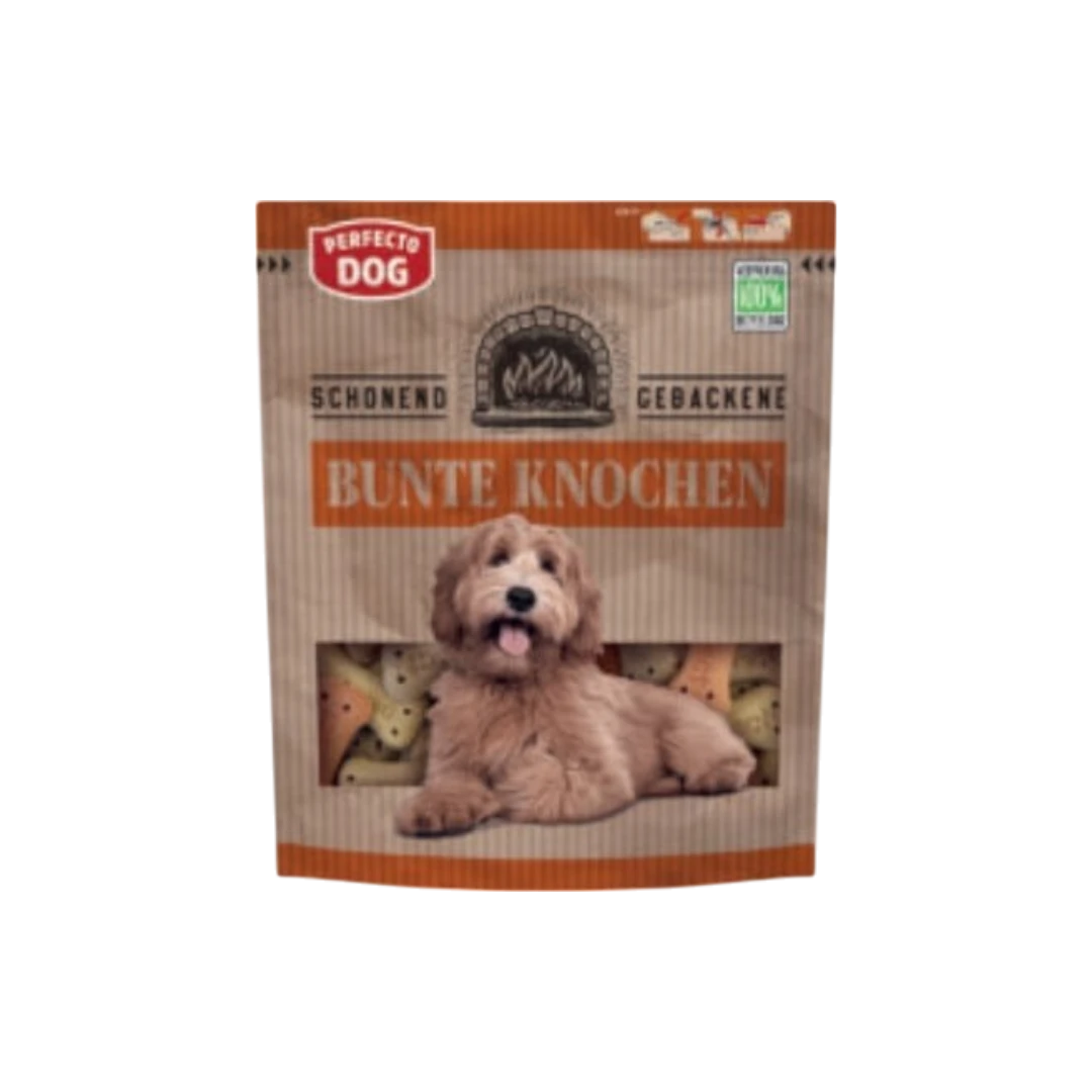 Perfecto Dog – вкусни и хрупкави бисквити за кучета под формата на големи цветни кокали с говеждо и птиче месо. За силни зъби и здрава енергия!
