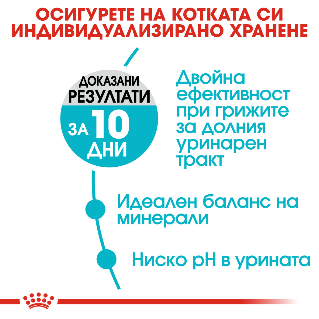 | ROYAL CANIN® Urinary Care е прецизно балансирана хранителна формула за поддържане на здравия уринарен тракт на вашата котка. ROYAL CANIN® Urinary Care е изключителна формула, която поддържа концентрацията на урина в здравословни граници като регулира минералния баланс и поддържа ниско pH на урината, което води до по-ниска концентрация на урината. При сравнение с обикновена храна, ROYAL CANIN® Urinary Care е доказано 2 пъти по-ефективна в поддържане здравето на долния уринарен тракт след 10 дни прием. За да задоволи индивидуалните предпочитания на всяка котка, ROYAL CANIN® Urinary Care се предлага и в мокър вариант – парченца в сос. Ако обмисляте смесено хранене следвайте препоръките за хранене, за да сте сигурни, че котката ви ще получи точното количество суха и мокра храна за оптимално задоволяване на нуждите ѝ.