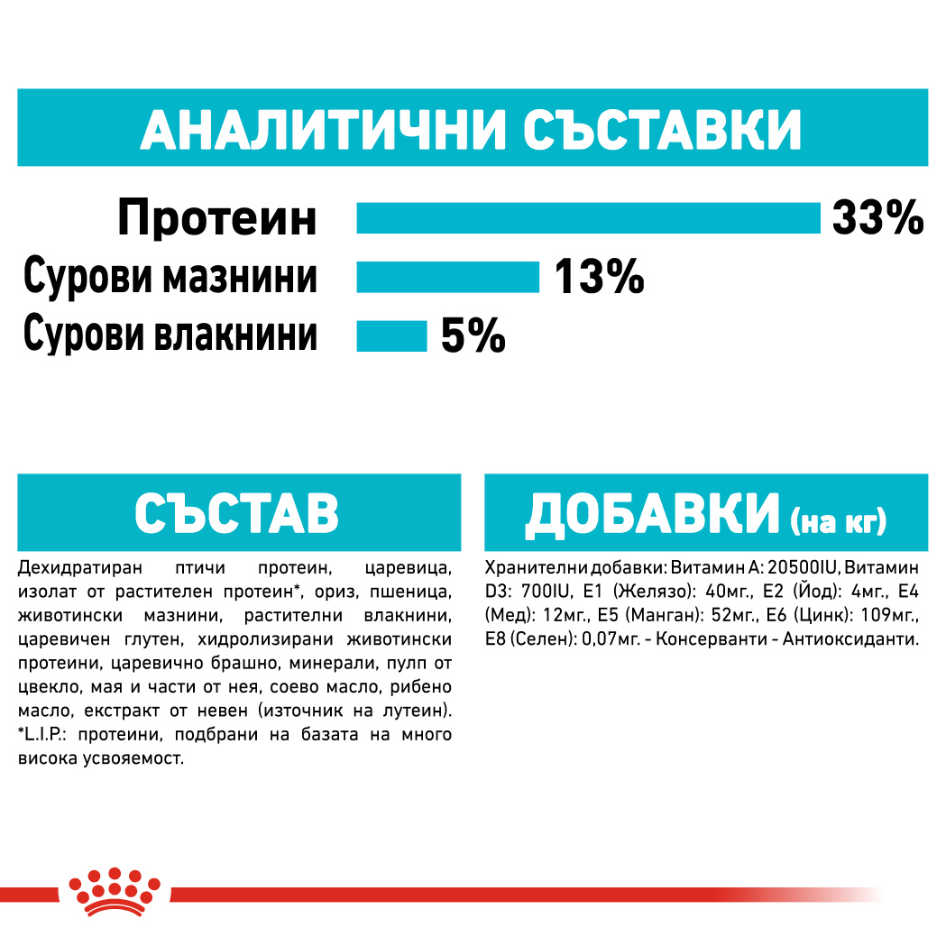| СЪСТАВ: Състав: Дехидратиран птичи протеин, царевица, изолат от растителен протеин*, ориз, пшеница, животински мазнини, растителни влакнини, царевичен глутен, хидролизирани животински протеини, царевично брашно, минерали, пулп от цвекло, мая и части от нея, соево масло, рибено масло, екстракт от невен (източник на лутеин).
